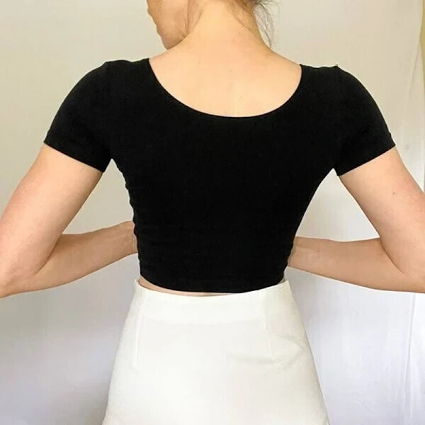 Crop tee featuring a scoop in the front and back. Stretchy for a figure-flattering fit. Machine wash cold. Use only non-chlorine bleach. Tumble dry low. Do not iron. Do not dry clean.