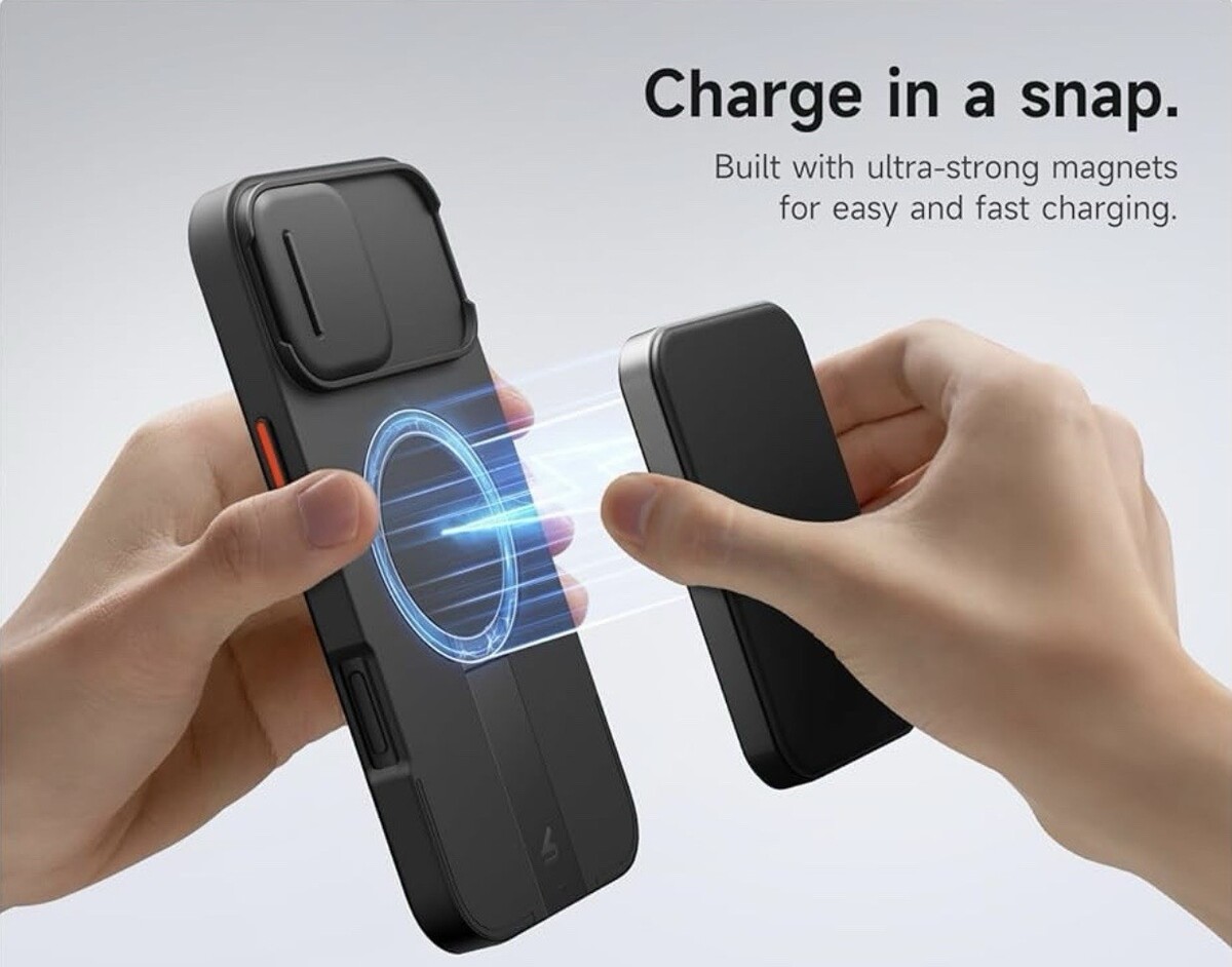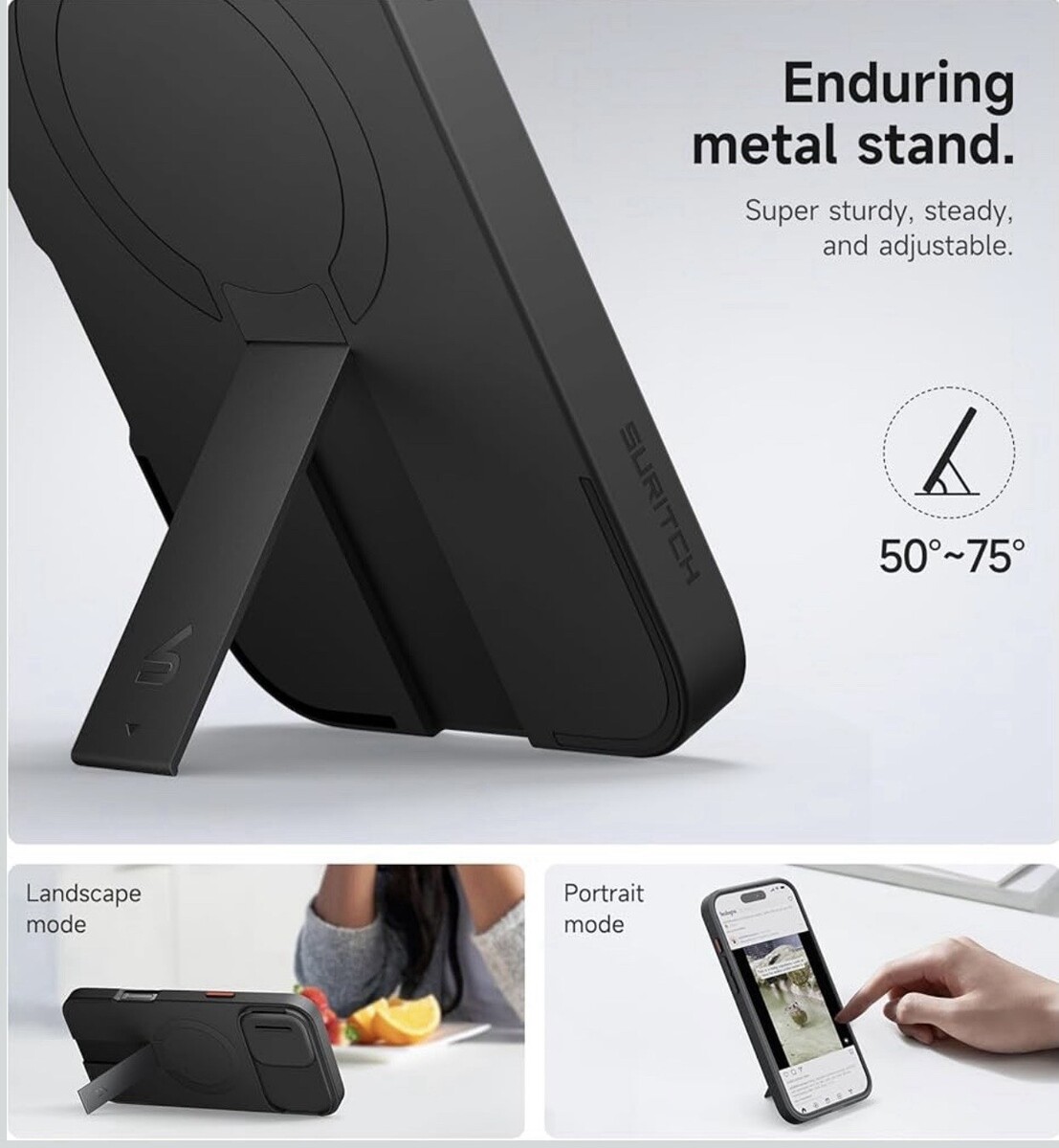 The SURITCH iPhone 16 Plus Case offers a luxurious and rugged design with a magnetic camera slide cover and adjustable kickstand.