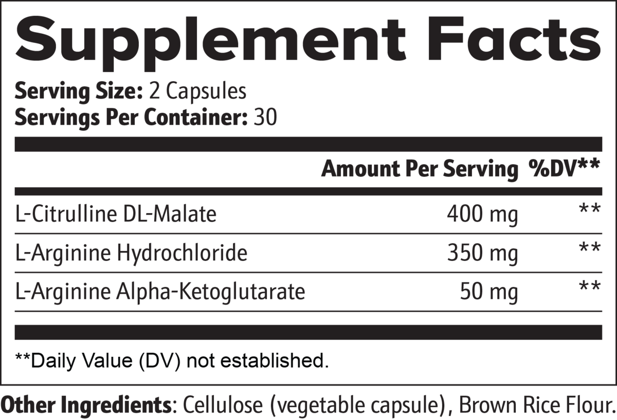 Ingredients: L-Arginine Alpha-Ketoglutarate, L-Arginine Hydrochloride, L-Citrulline DL-Malate, Cellulose (vegetable capsule), Brown Rice Flour.