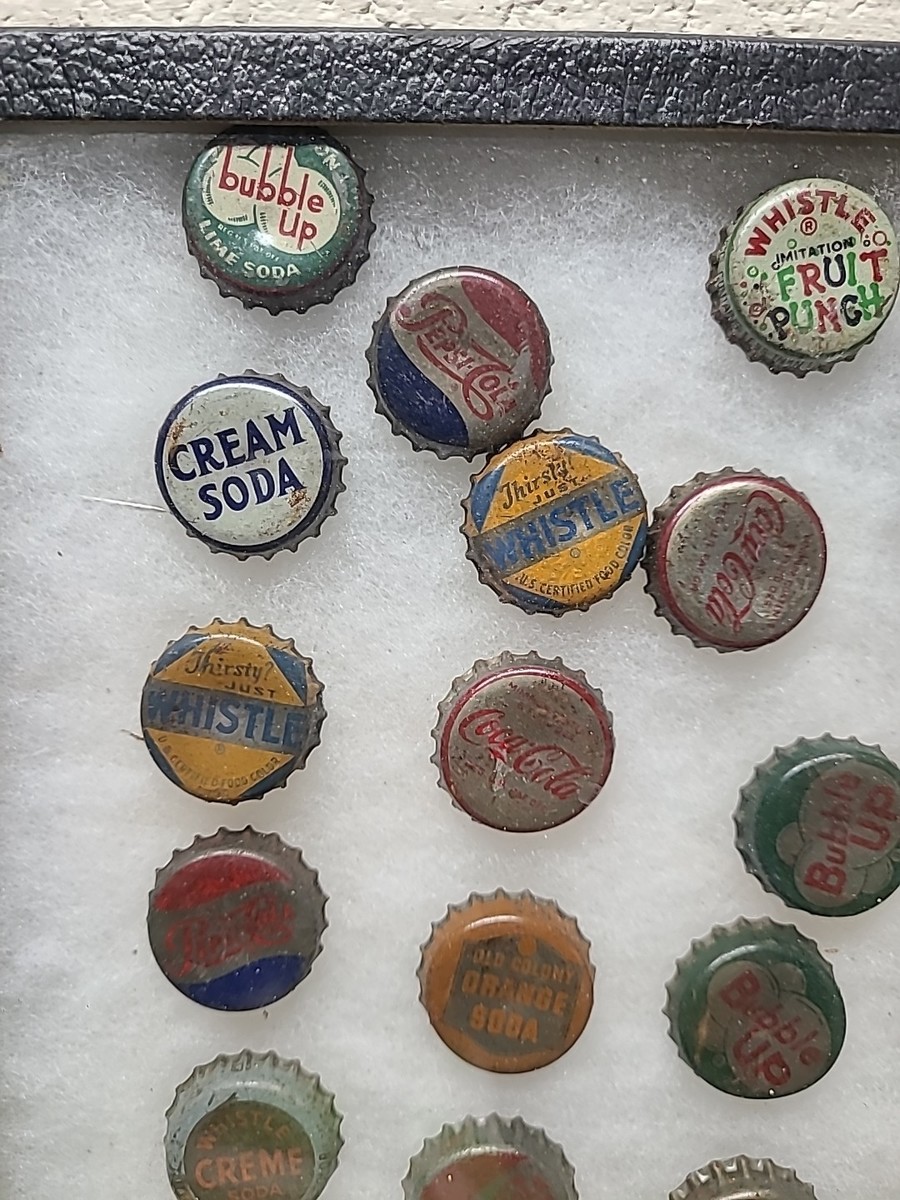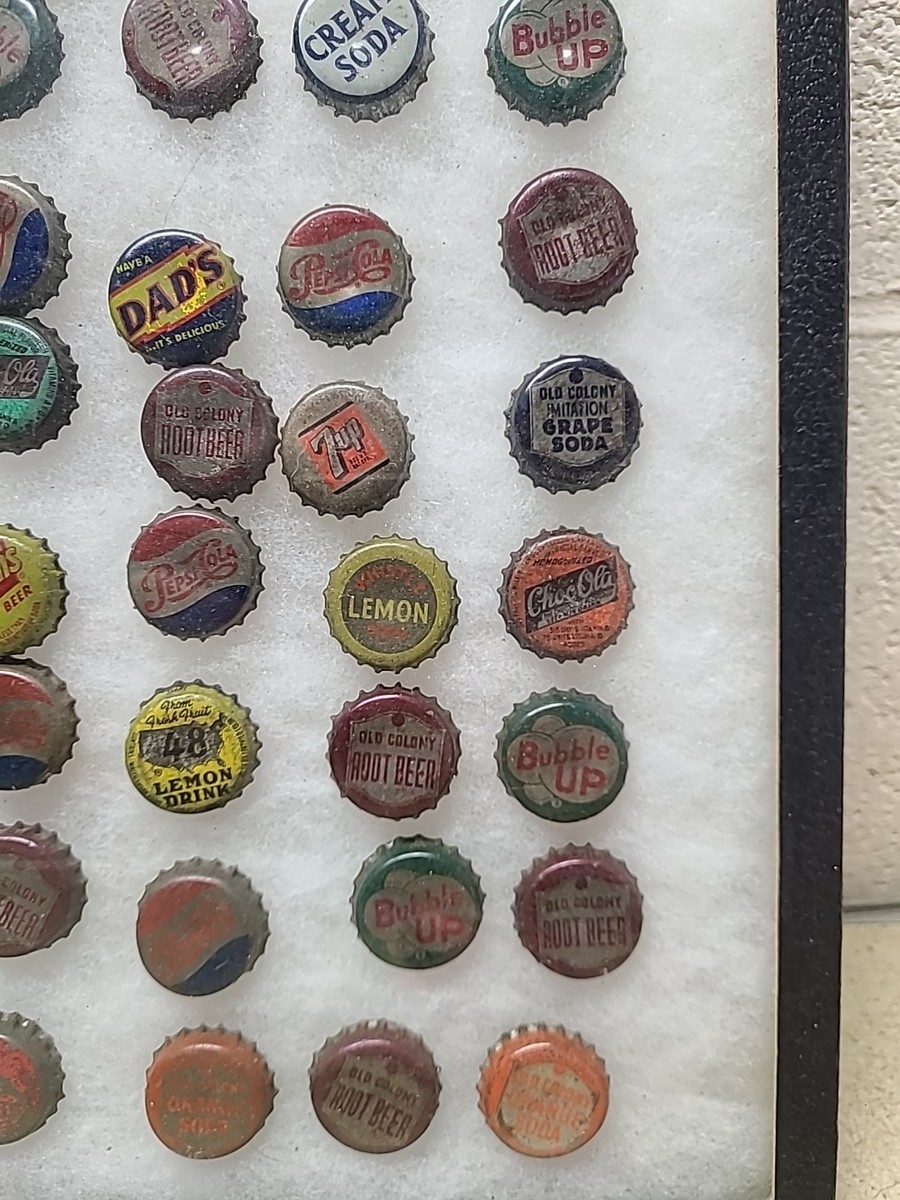 This vintage bottle cap display features a collection of 60 pieces from popular soda brands such as Pepsi, Whistle, Bubble Up, and Coca-Cola. The display is perfect for collectors of advertising memorabilia, specifically bottle caps. The variety of brands and designs on the caps makes for an interesting and unique display.