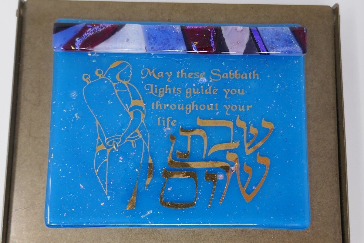 The Gary Rosenthal Travel Shabbat Candle Holder is a unique and handmade piece that represents the Jewish religion. This measures approx. 4.25" wide and 3.75" tall. The glass has no chips, cracks or repairs. Inside the metal box is a brass candle holder and 2 Shabbat candles. The fusion of glass and metal in its creation adds a modern and contemporary touch to traditional religious symbolism, making it a special and meaningful item for both everyday use and special occasions.