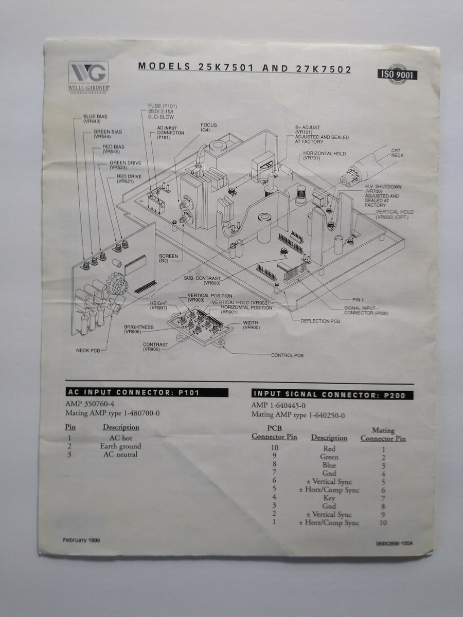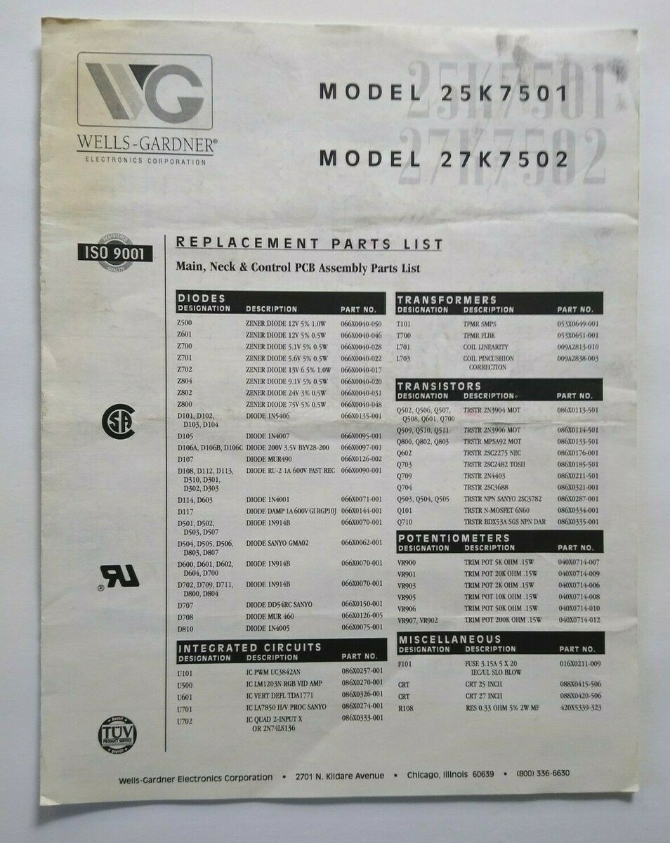Wells Gardner Video Arcade Game Monitor Display Replacement Parts List 25K7501