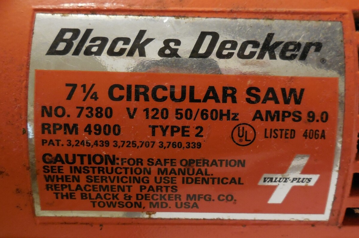 For Sale is a Used but in good Condition B + D Black and Decker 7 1/4" Circular Saw 9 Amps 4900 RPM Model 7380 TESTED and Works.. Comes with Blade but it may need to be replaced soon. Please see photos for more details. Saw will be Shipped Double Boxed to protect its journey to its new home (Postal workers can be very ROUGH on packages) the Outer Box is 14x14x14 this is why Shipping May Seem High but this is the shipping that the USPS or UPS is charging (i.e. Exact Shipping). Please ask any and all questions prior to purchasing. Fast same or next day shipping with delivery confirmation within the U.S.