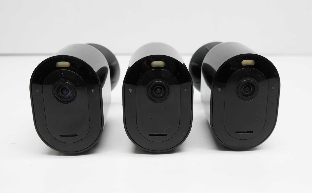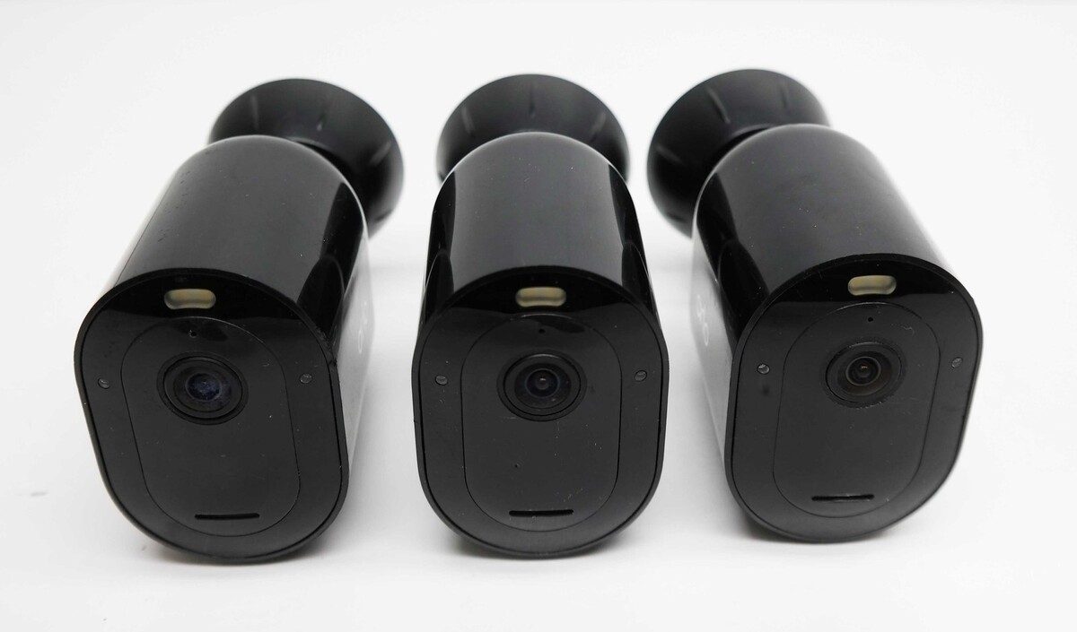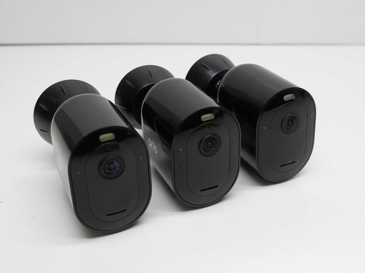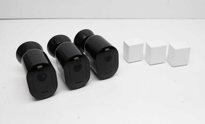 Description: Includes 3x Arlo Pro 4 Cameras with Anti-Theft Housings (Black) and 3 x Rechargeable Batteries Only. Wall Plate and Secure Attachment Are Missing. Scratched bodies of cameras.