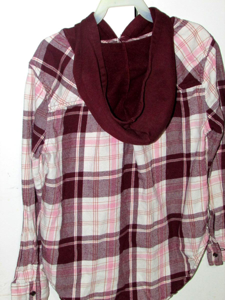 Plaid hoodie long-sleeved shirt in brown, white, and peach colors is perfect for girls or boys in size MEDIUM-8 The shirt features a button closure and a solid brown hoodie accent, ideal for casual everyday wear. Made from light flannel fabric, this stylish hoodie shirt provides both comfort and style for kids who love to play and stay active.