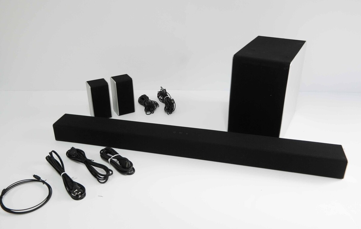 Description: Includes Soundbar, Subwoofer, 2x Rear speakers, 2x Speaker cables, HDMI cable, Optical cable, 2x Power cords nothing else. Scratches and scuff son the bodies. Tears in fabric on soundbar and sub.