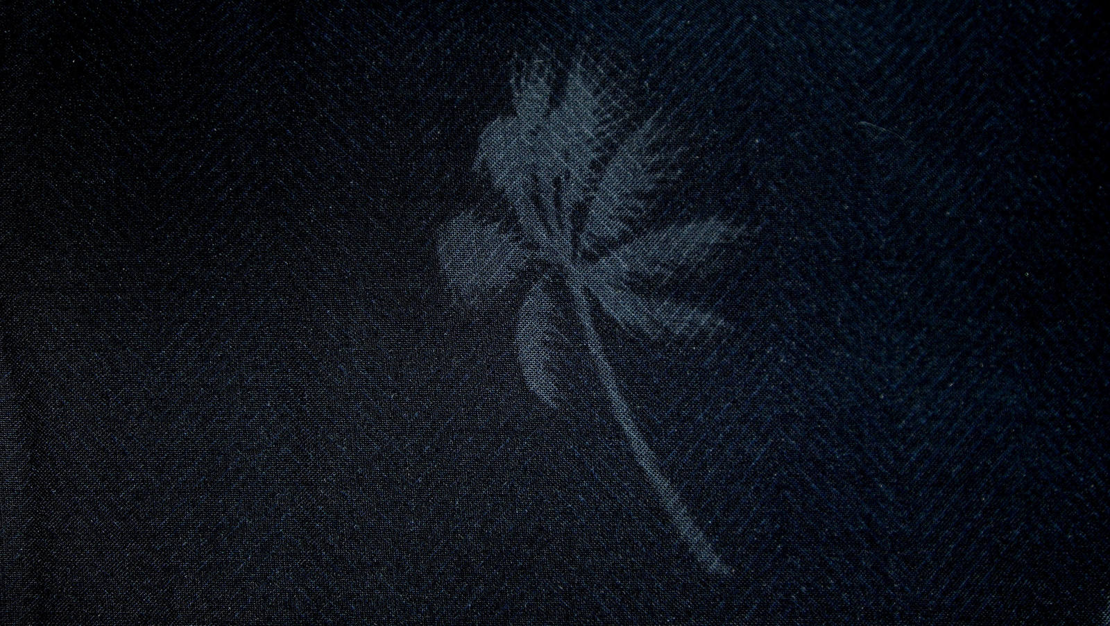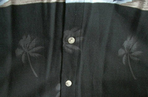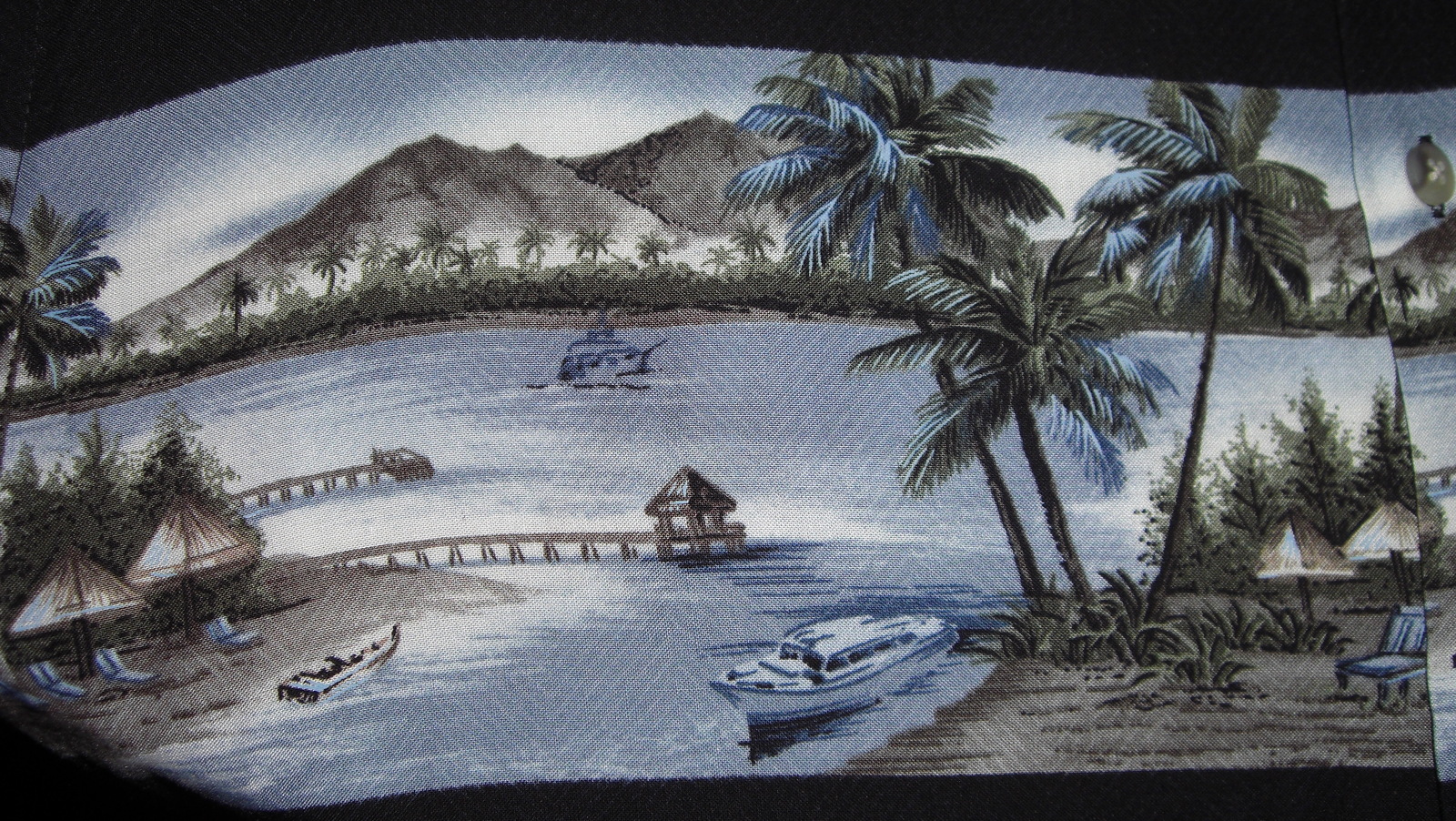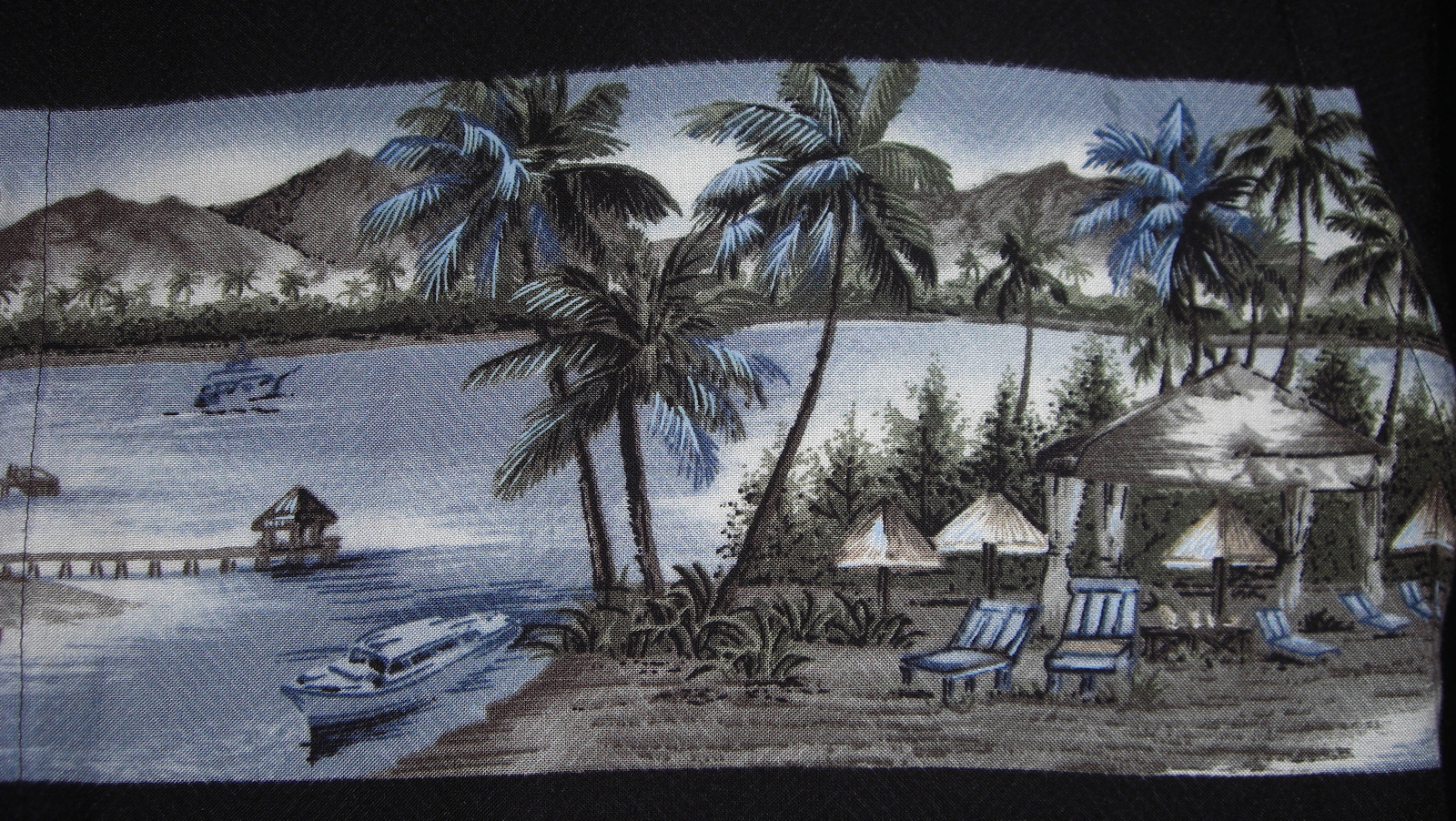 Mens Pierre Cardin Hawaiian Print Shirt - Black with faint palm trees in dark gray. 5 inch band around the chest with island scene cabanas and boats. Size Large