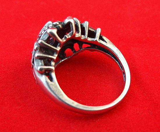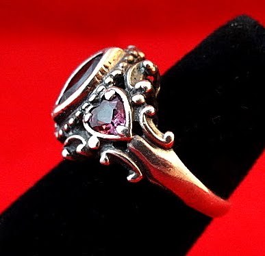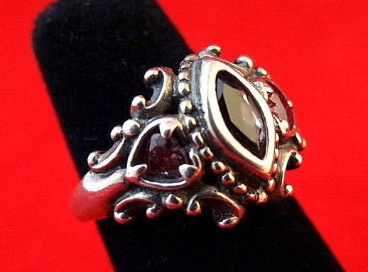 SoVintageous is offering this gorgeous sterling silver ring with 3 beautiful faceted amethyst gemstones. The marquise shaped amethyst in the middle is inlaid while the heart-shaped stones on each side are triple prong-set. All 3 are surrounded by wonderful ornate sterling silver detailing.