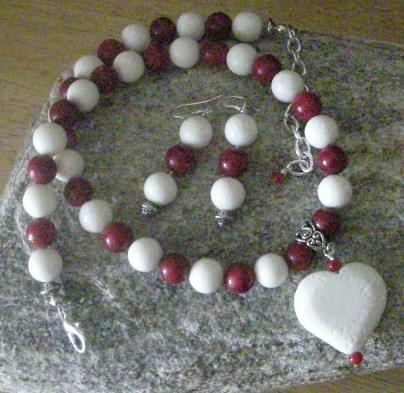 Genuine red white totally coral heart beads necklace with matching earrings.