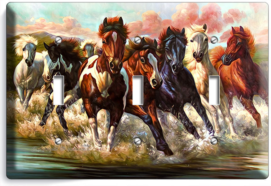WILD AMERICAN HORSES RUNNING IN RIVER WATER TRIPLE LIGHT SWITCH WALL PLATE COVER
