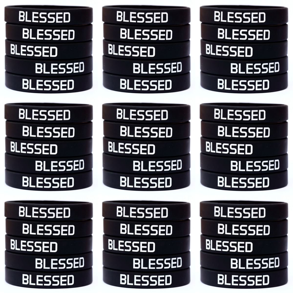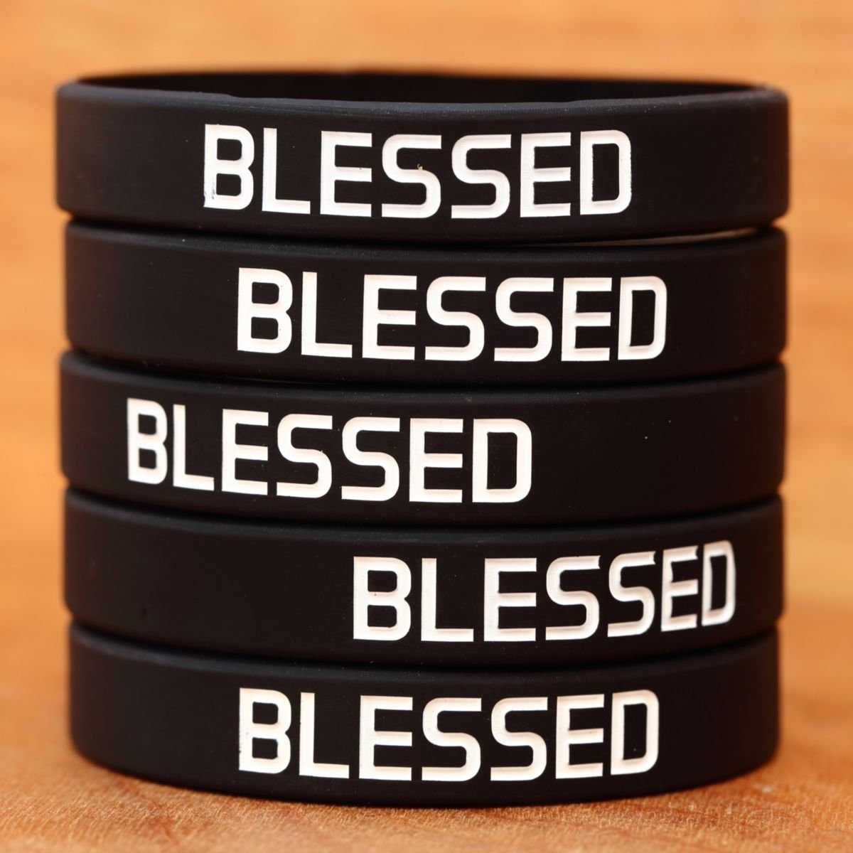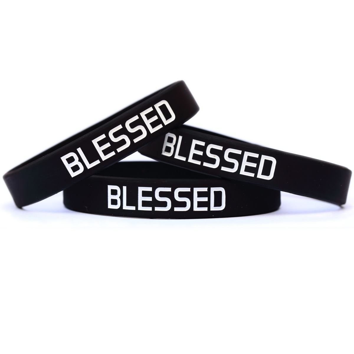BLESSED message on high quality silicone wristbands. The message on these bands is clear and bold. The text on these wristbands is debossed and color filled using a two-step process. Using a custom mold we first create bands with indented text and/or images for you. Then we paint fill those locations so your custom design is recessed below the top of the bands. The result is a better looking and much longer lasting wristband (compared to screen printed and other types of color text bands).