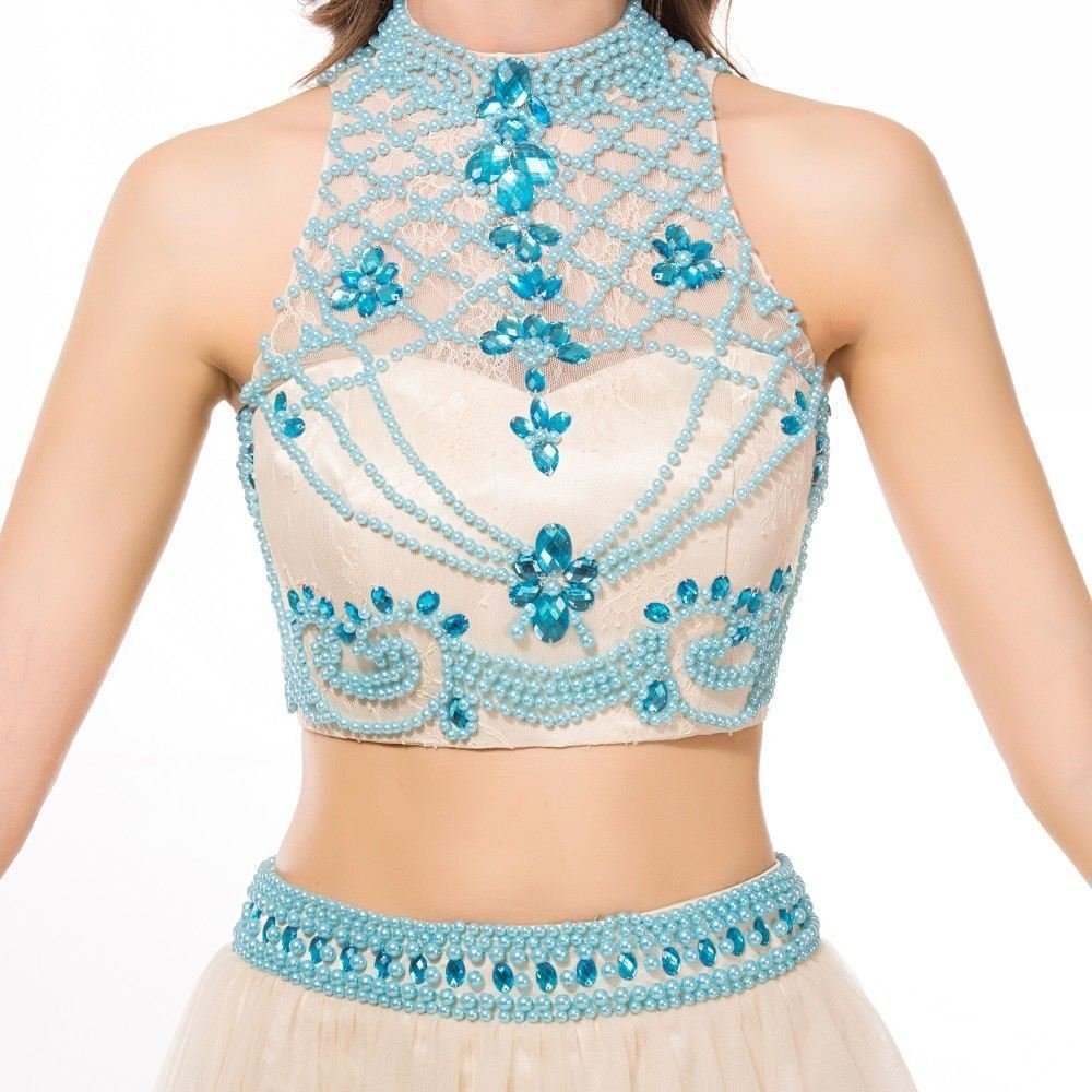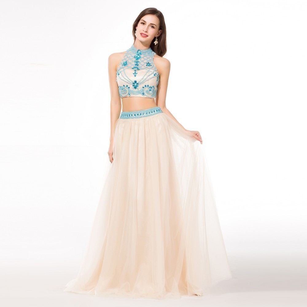 Kivary? Champagne Tulle Halter 2 Pieces Crystals Pearls Lace Backless Formal Eve