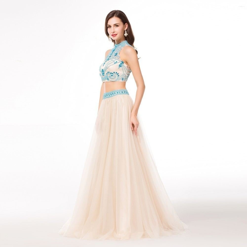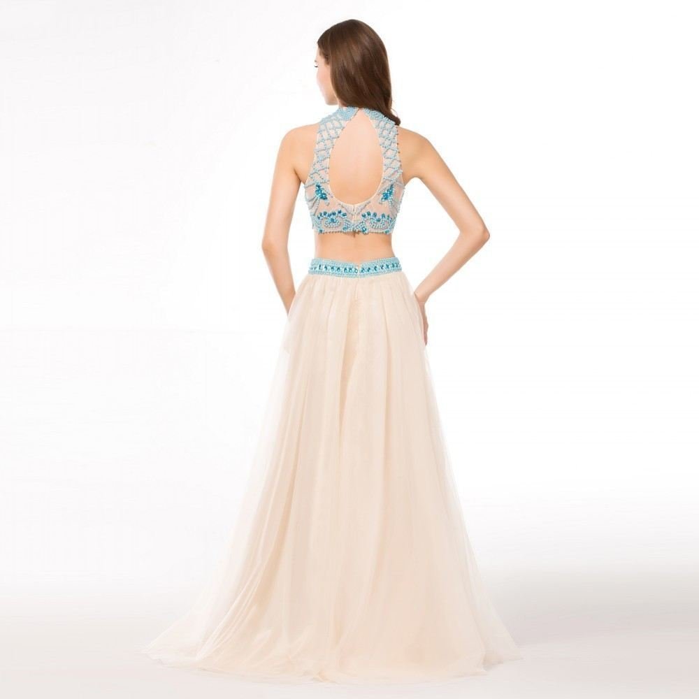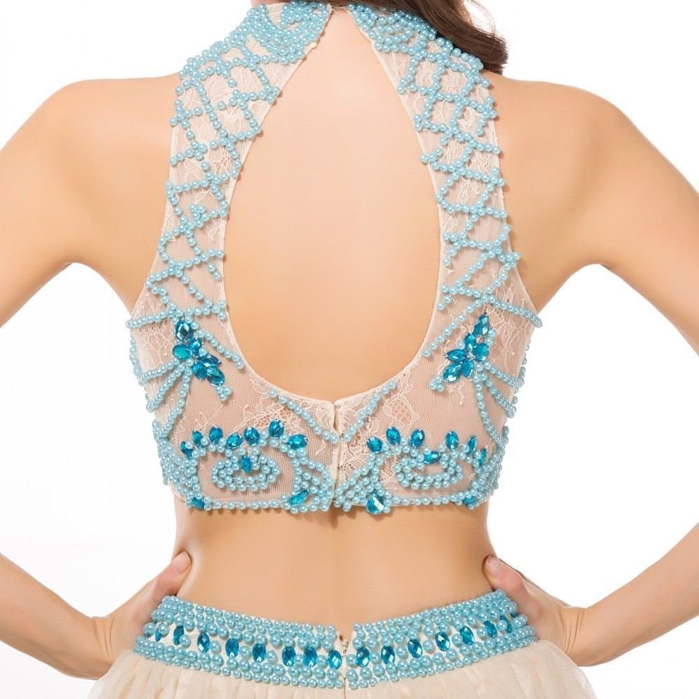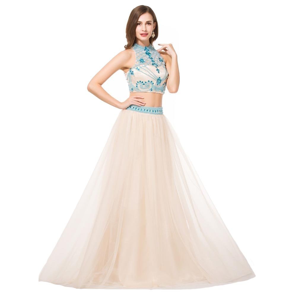Kivary? Champagne Tulle Halter 2 Pieces Crystals Pearls Lace Backless Formal Eve
