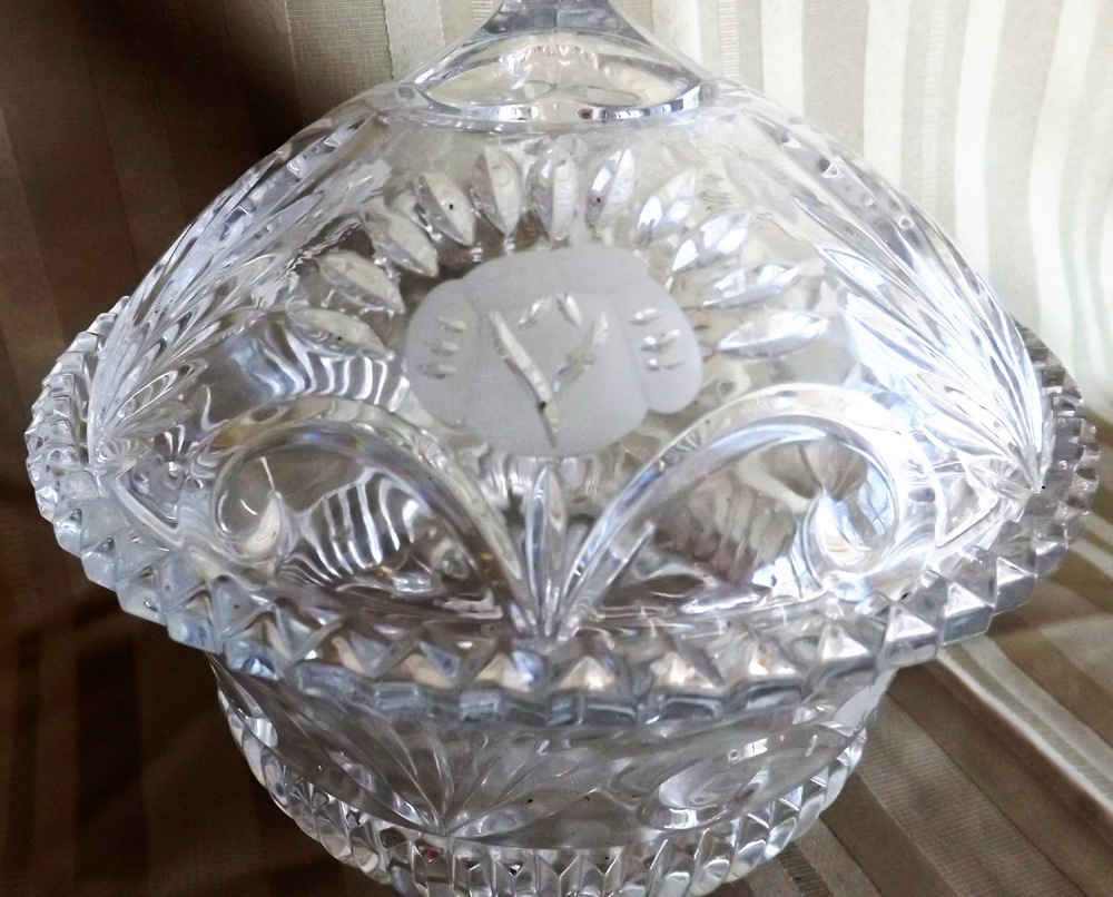 Elegant etched crystal candy dish features removable top and beautify floral design.