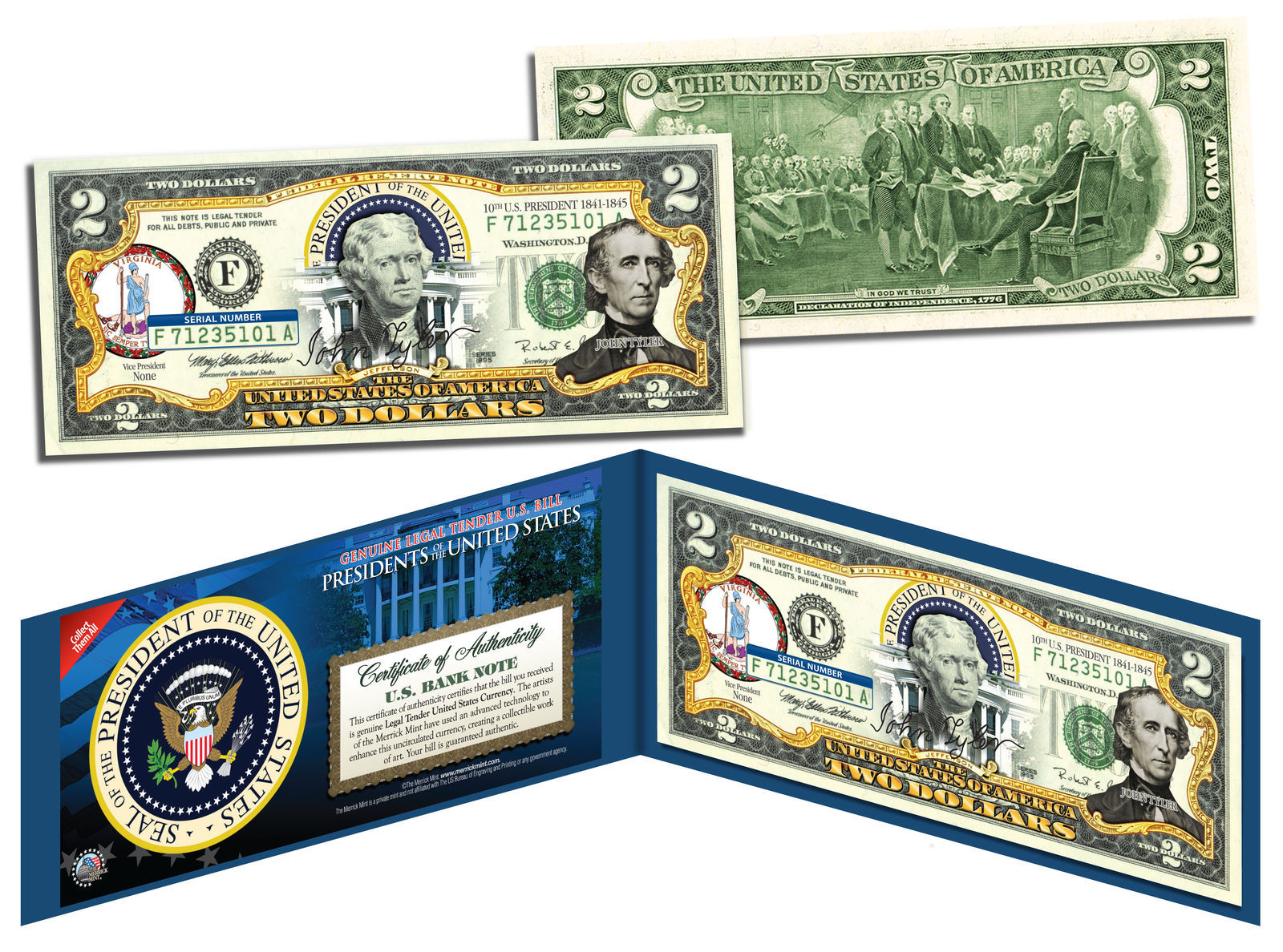 JOHN TYLER * 10th U.S. President * Colorized $2 Bill US Genuine Legal Tender