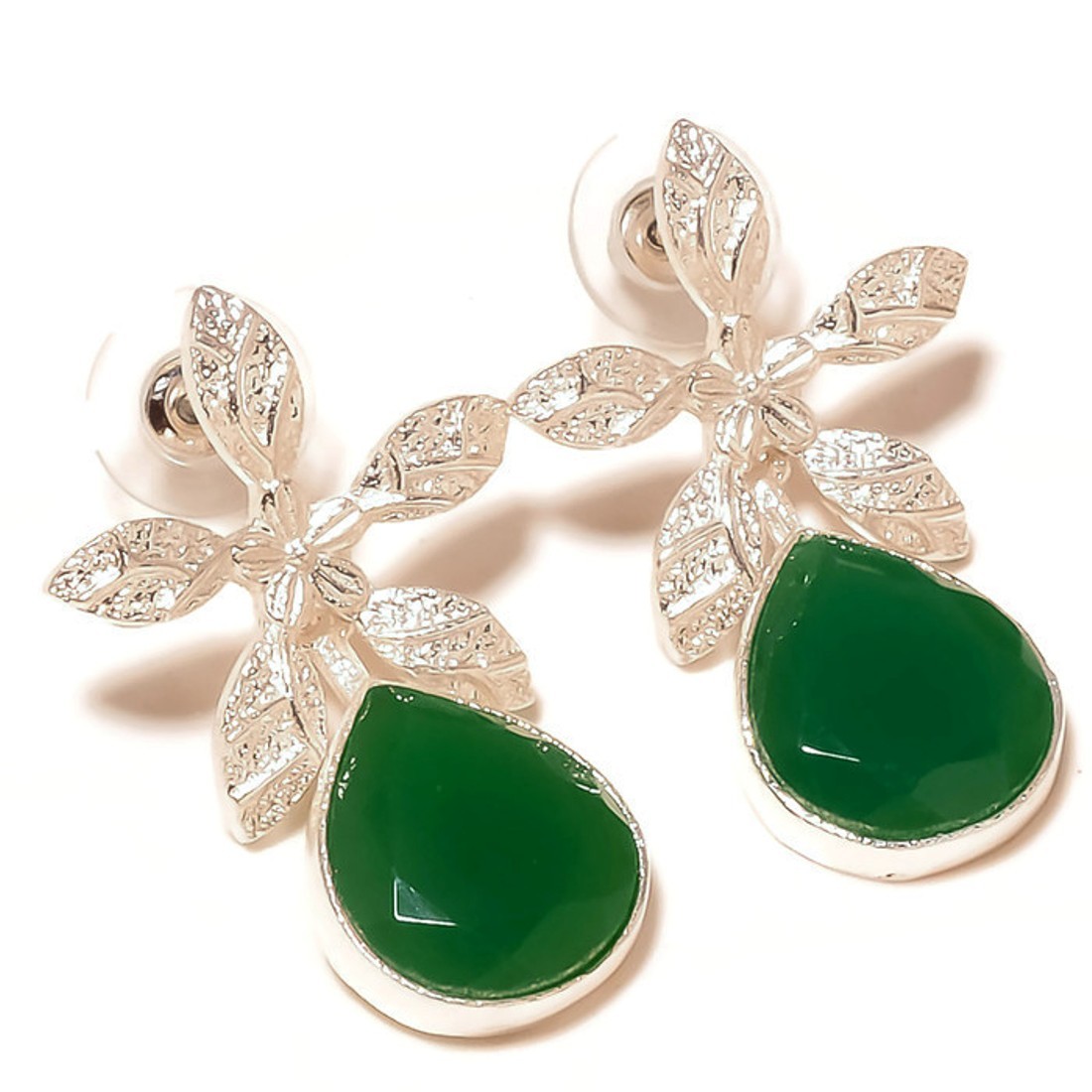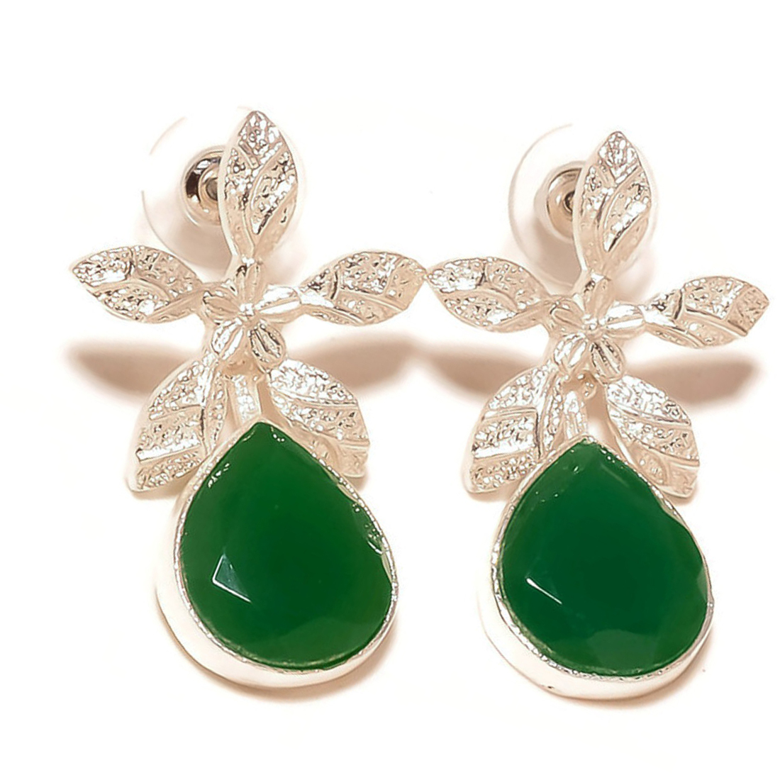 Green Onyx Pear Gemstone 925 Silver Overlay Handmade Flower Drop Dangle Earrings