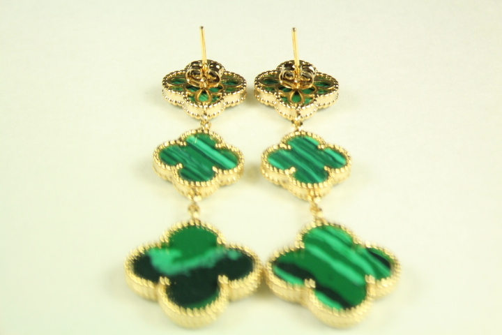 Triple hanging malachite motif earrings. Gold plated over non tarnishing surgical steel.