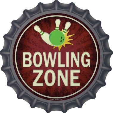 Bowling Zone Novelty Metal Bottle Cap 12 Inch Sign. Made of the highest quality aluminum for a weather resistant finish. It is lightweight durable. Pre-drilled holes for quick and easy mounting. Add a ribbon, wire or string to instantly personalize your sign. Individually shrink-wrapped and proudly made in the USA.