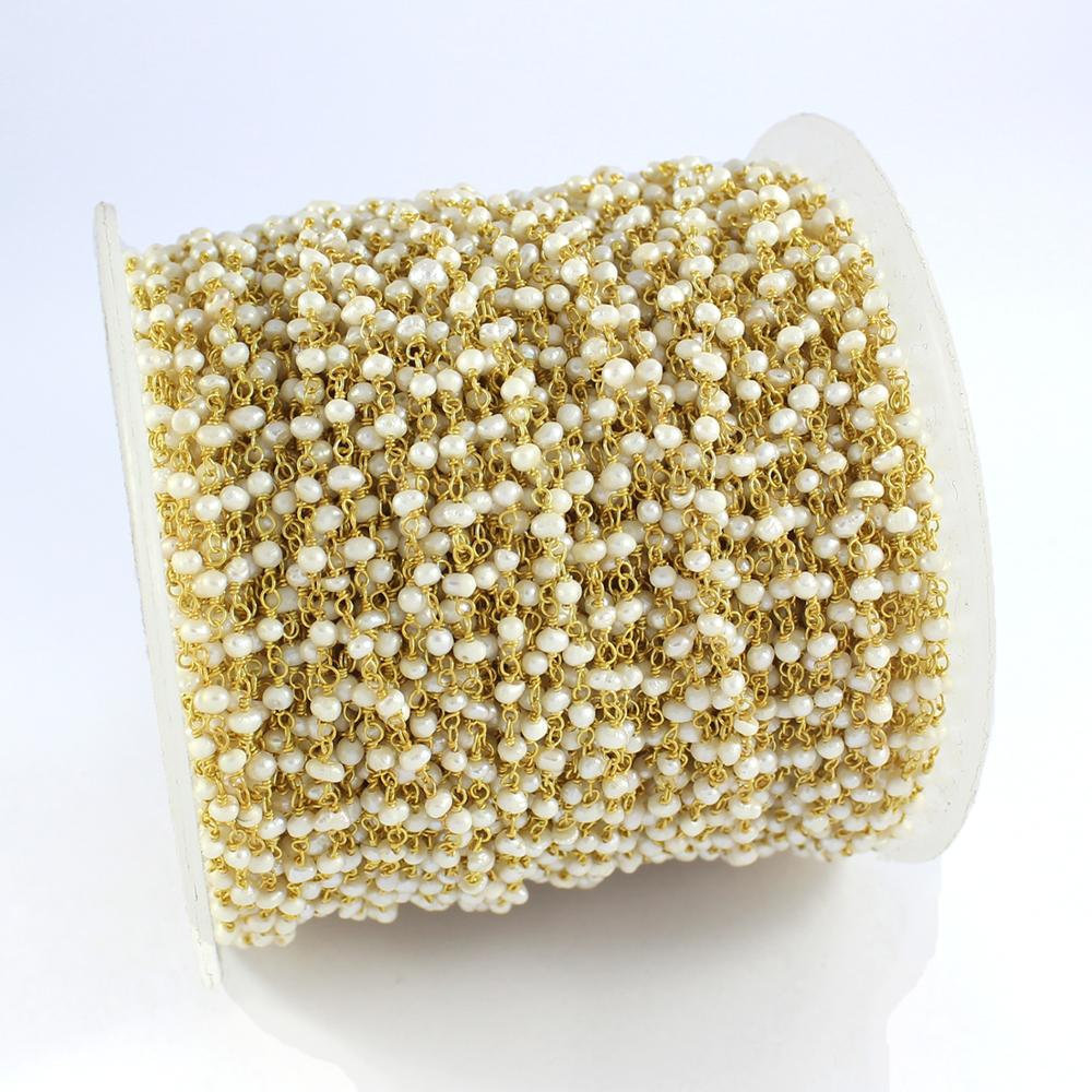 Pearl Rosary Chain-Pearl Gemstone Beaded Chain-Wire Wrapped Chain-3.00 mm to 3.50 mm Roundel Faceted Cut Gemstone Link Chain By Foot-Pearl