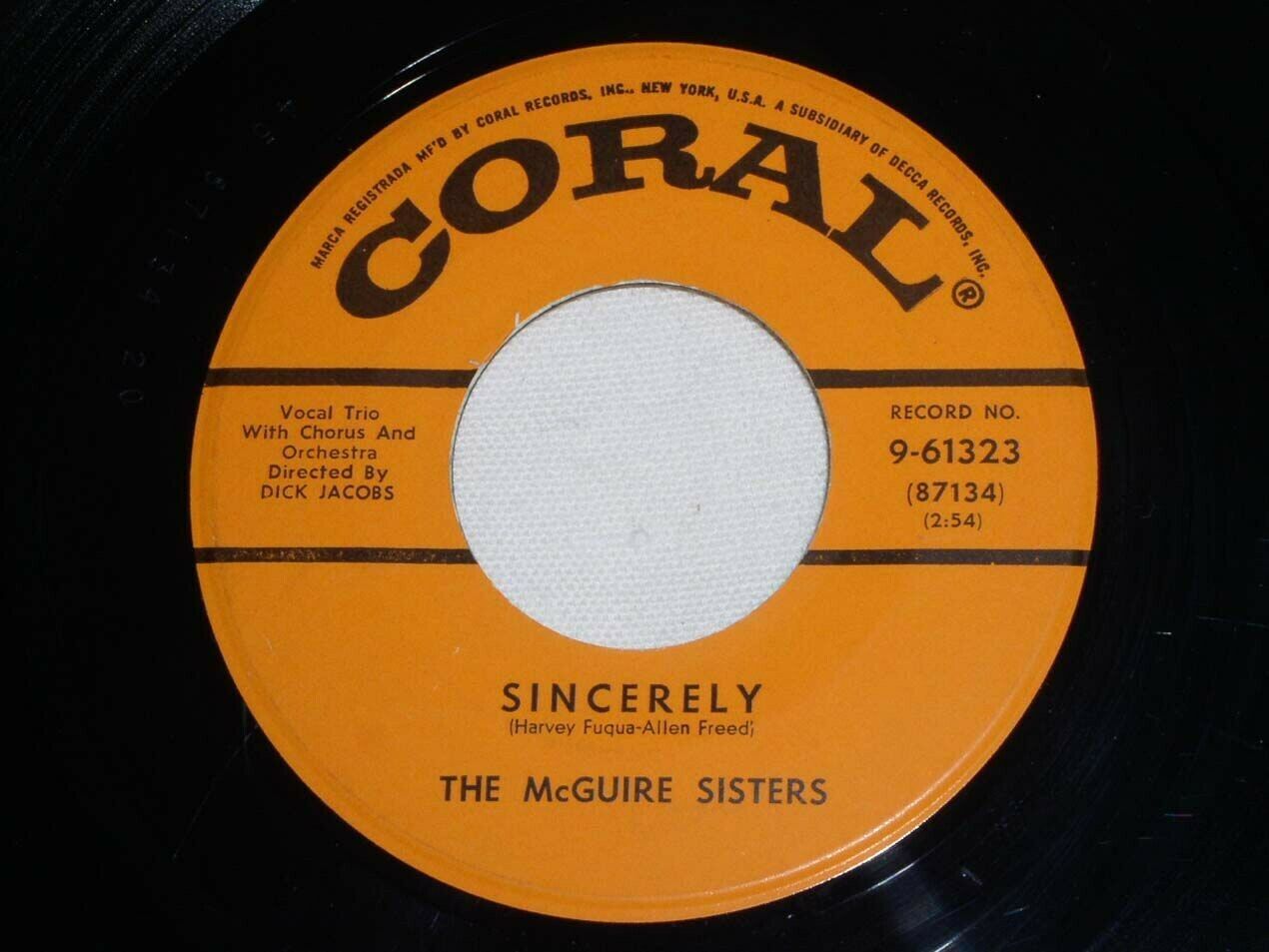 This is the original vintage 45 rpm phonograph record by The McGuire Sisters Entitled, "Sincerely". Flipside: "No More". Record label Coral 9-61323.