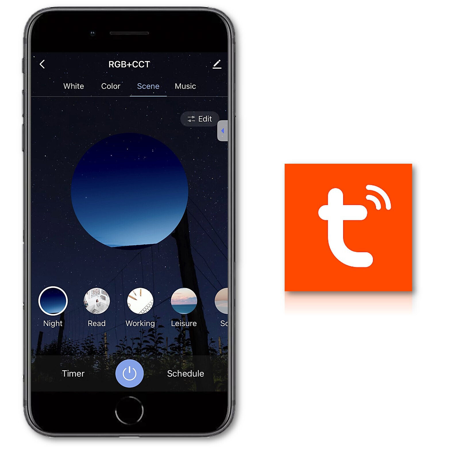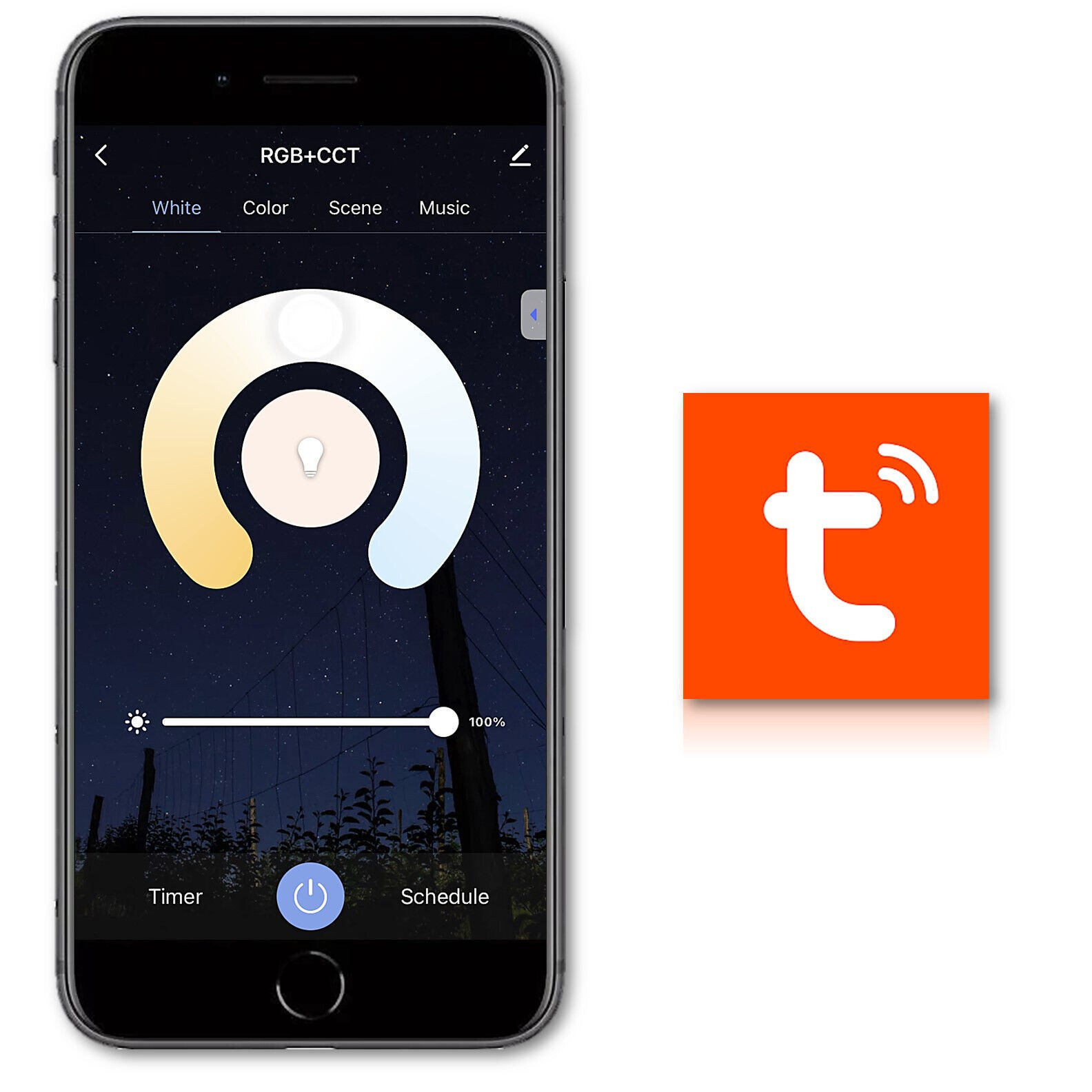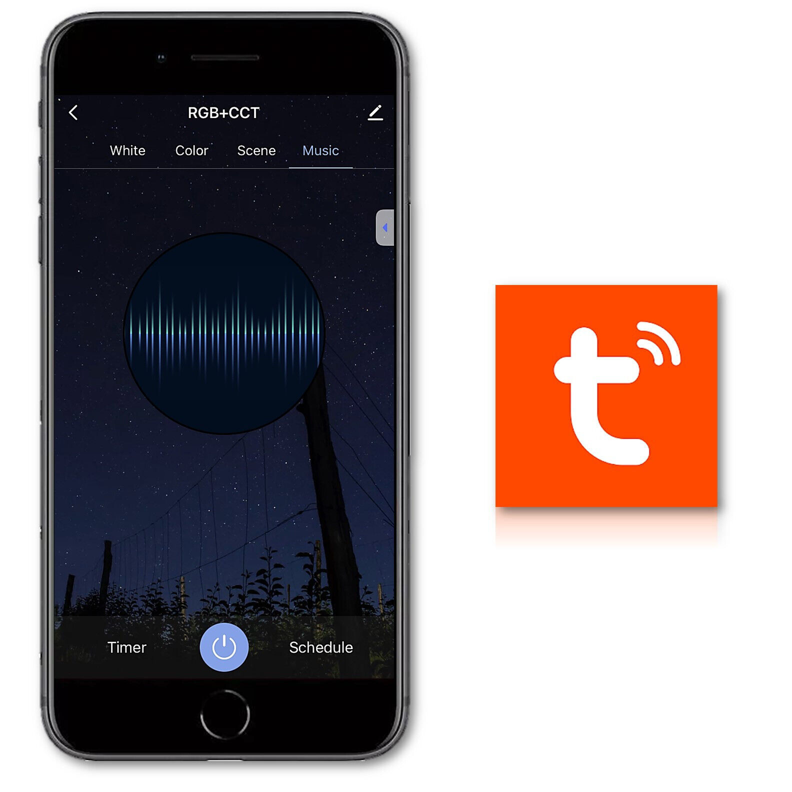 App Options Include RGB Custom Color Change, Brightness, Timer, Scene Settings, Music Play Voice Control